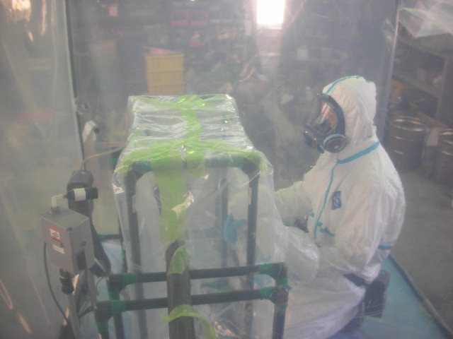 - 作業範囲の床面及び壁面を、足場枠等によりプラスチックシートで囲い、接合部、貼り付け部は粘着テープで貼り付け、室内を負圧状態とする。