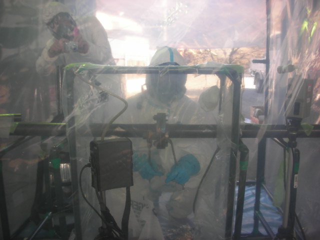 - 作業員は曝露の危険のないよう、保護衣、マスク等を正しく着用する。