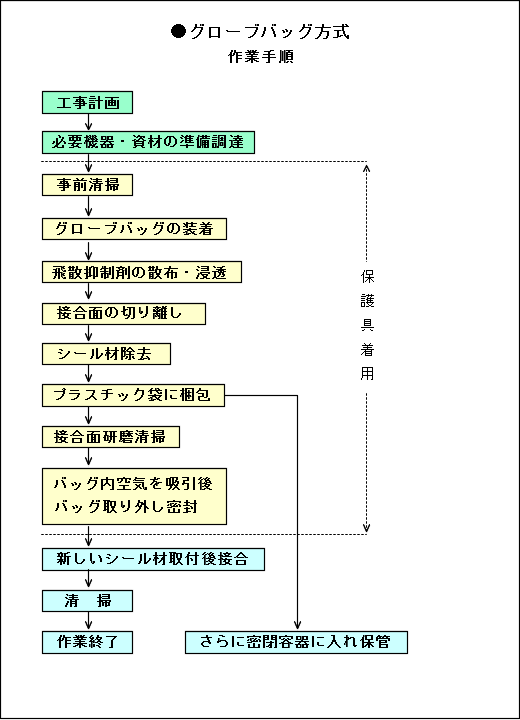 - 取り外したシール材は水・飛散防止剤などで湿潤状態を保ち、プラスチック袋に梱包し密閉容器に入れ保管する。